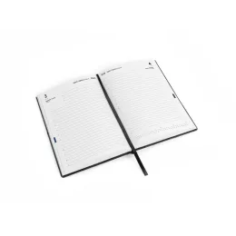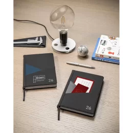 Agenda A5 em PU. Possui 2 bolsos exteriores na capa para guardar pequenos objetos e um marcador em fita. Está organizada num plano diário. 148 x 210 mm