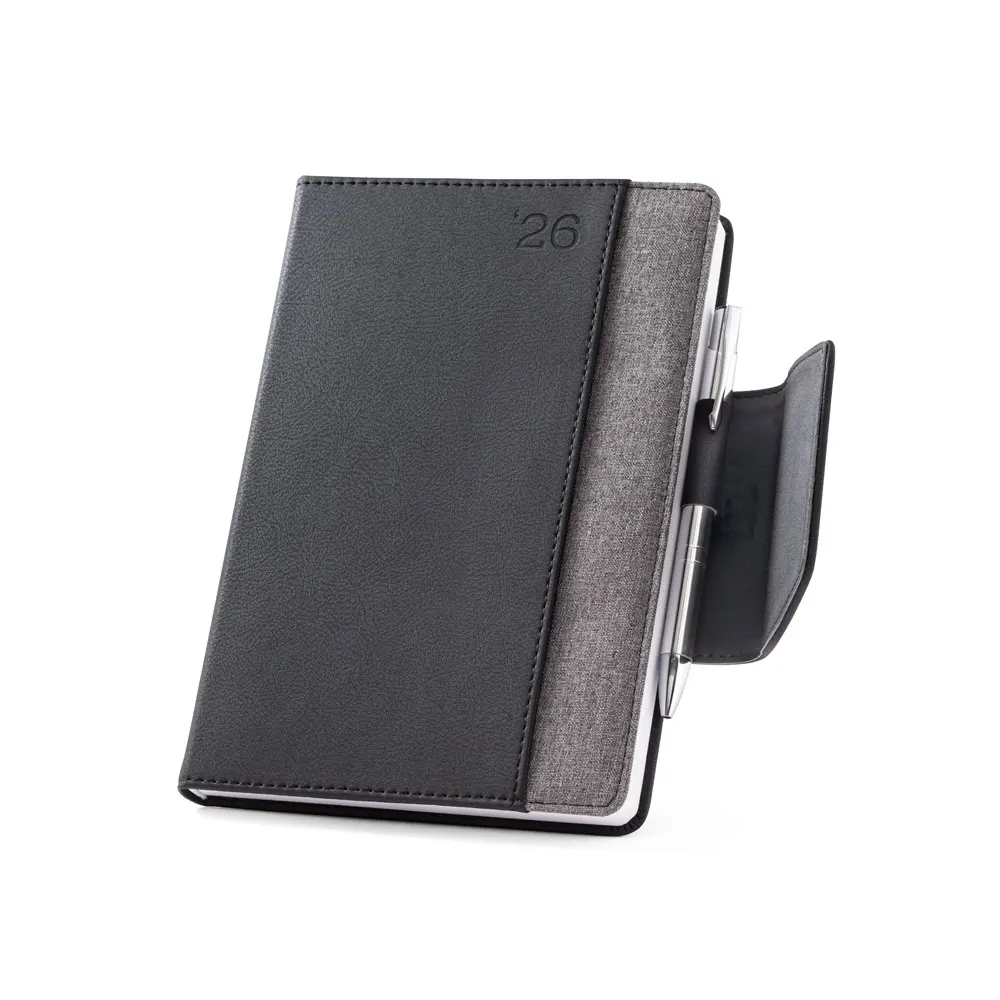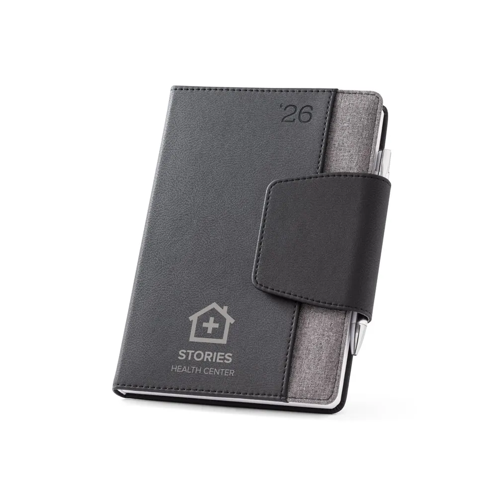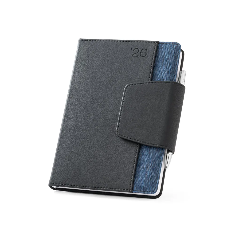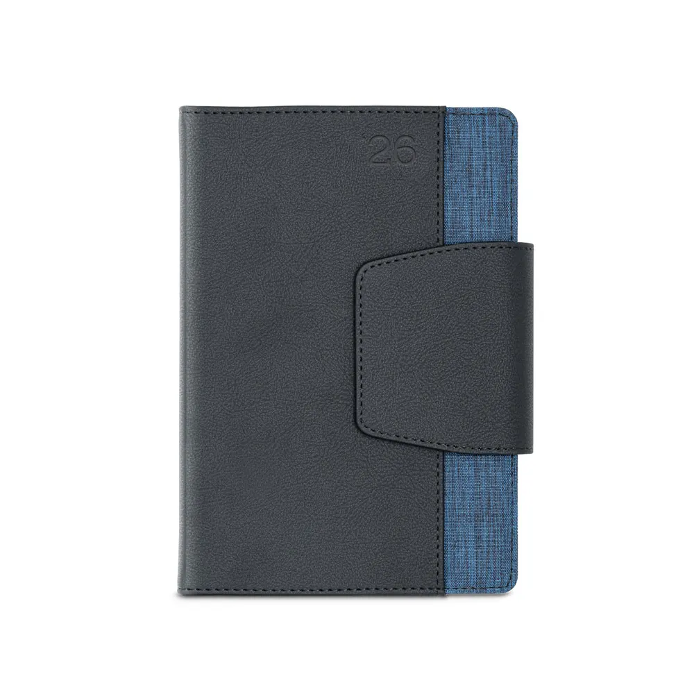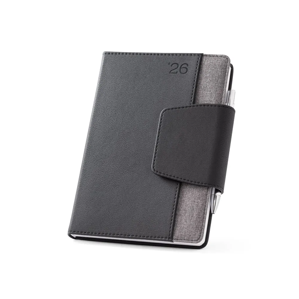 Agenda bi-material A5 em c. sintético e tecido em poliéster. Agenda com fecho magnético, bolso frontal e suporte para esferográfica. Fornecida com bolsa de non-woven. Esferográfica inclusa. 148 x 210 mm | Bolsa: 205 x 250 mm