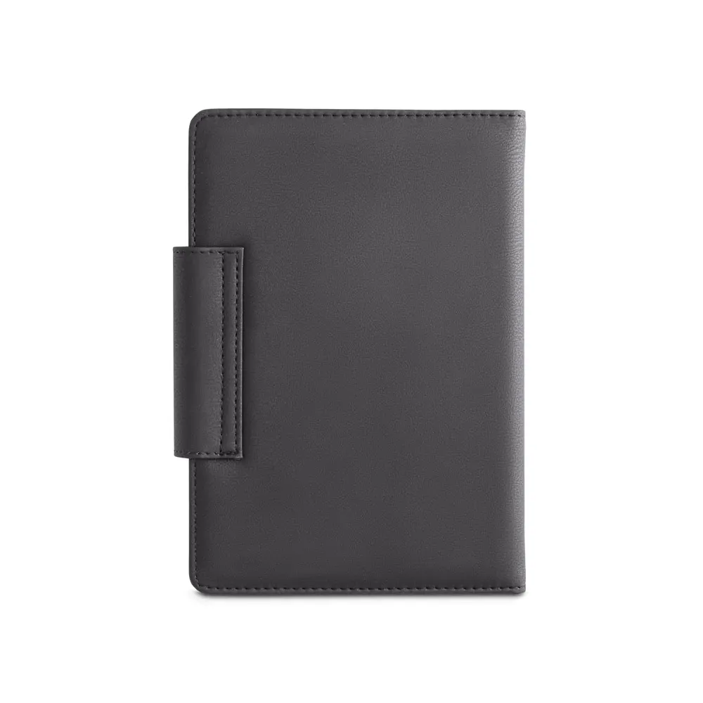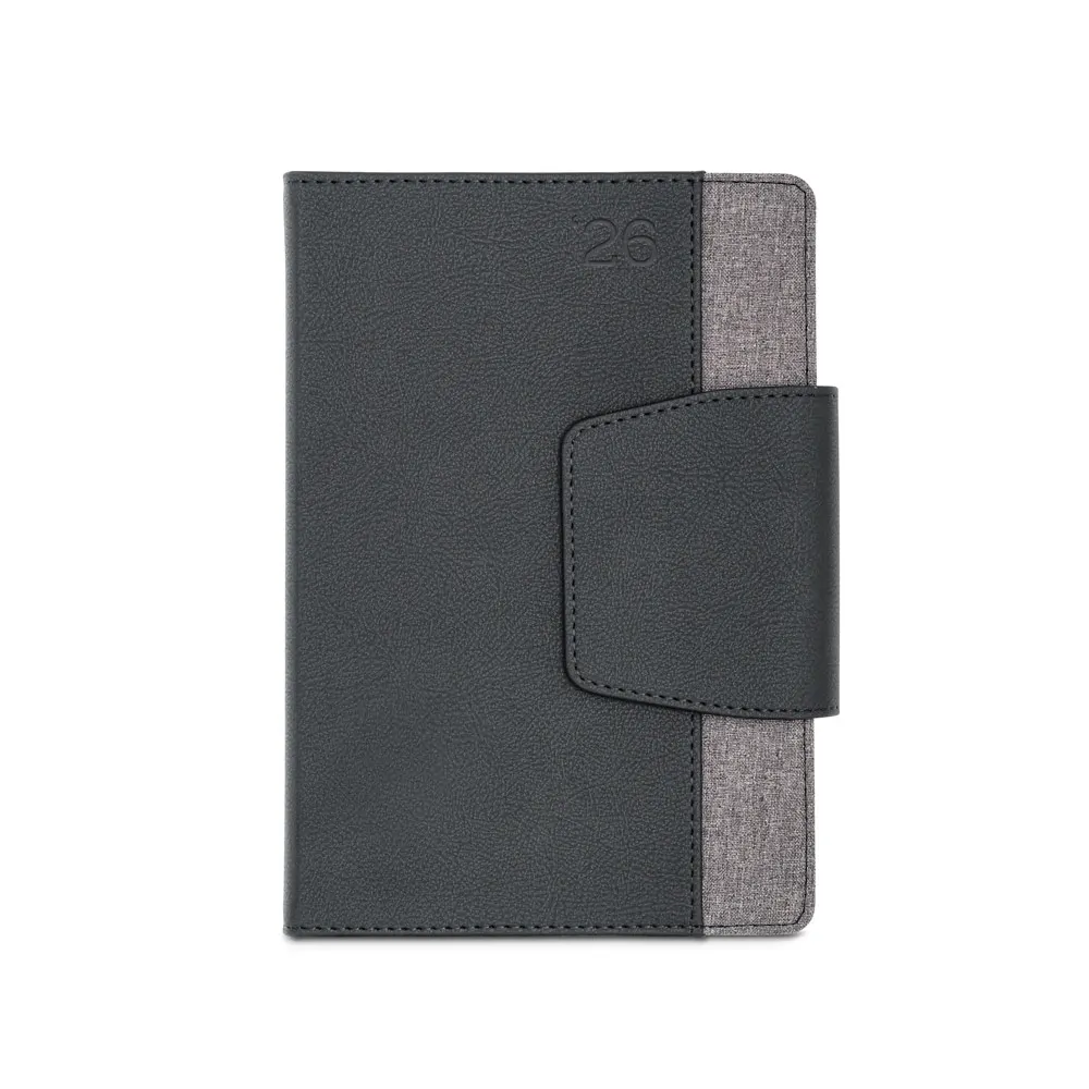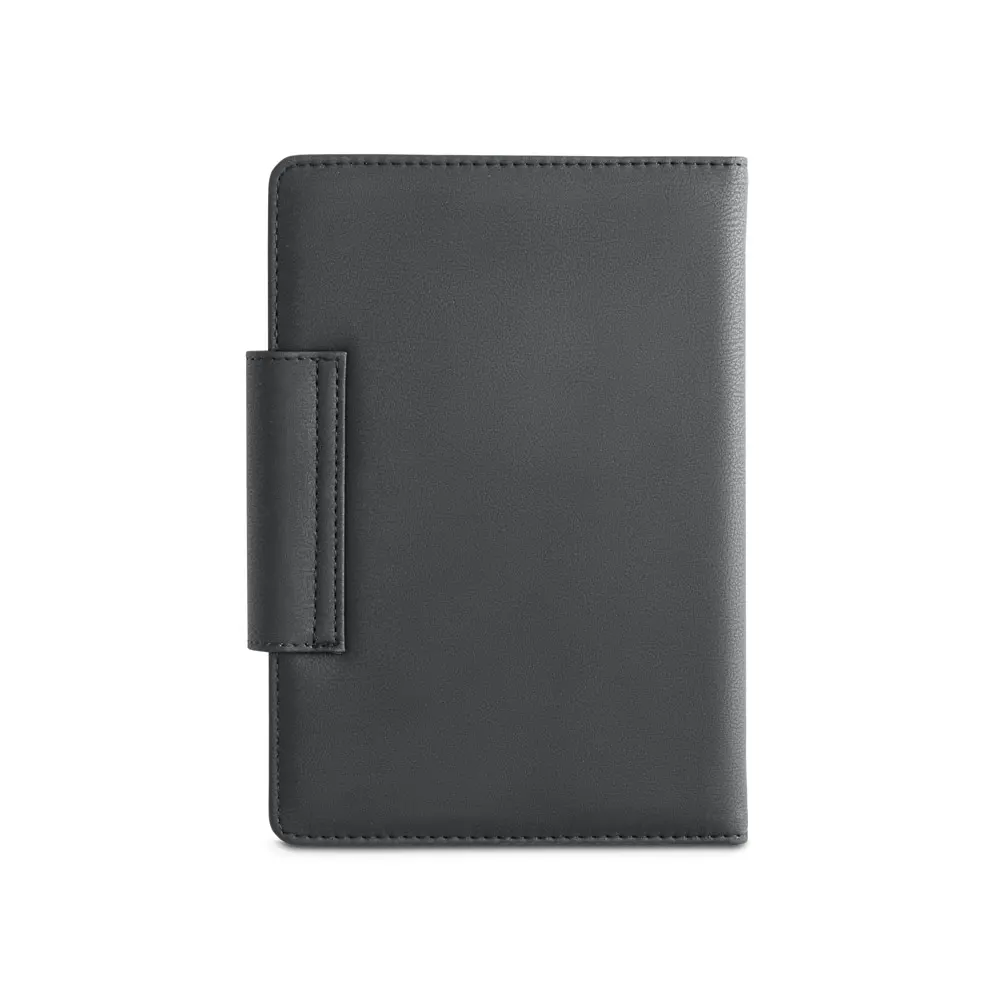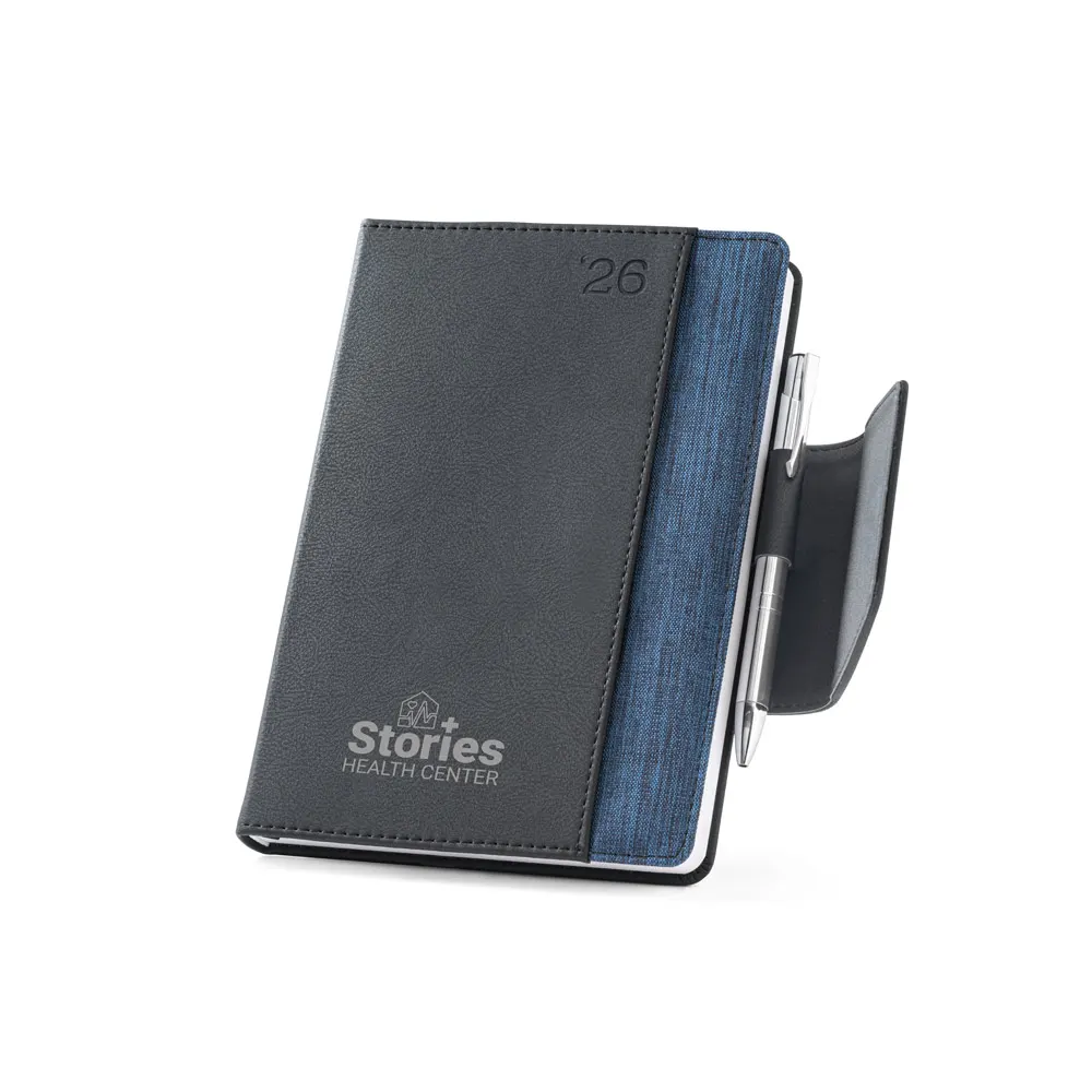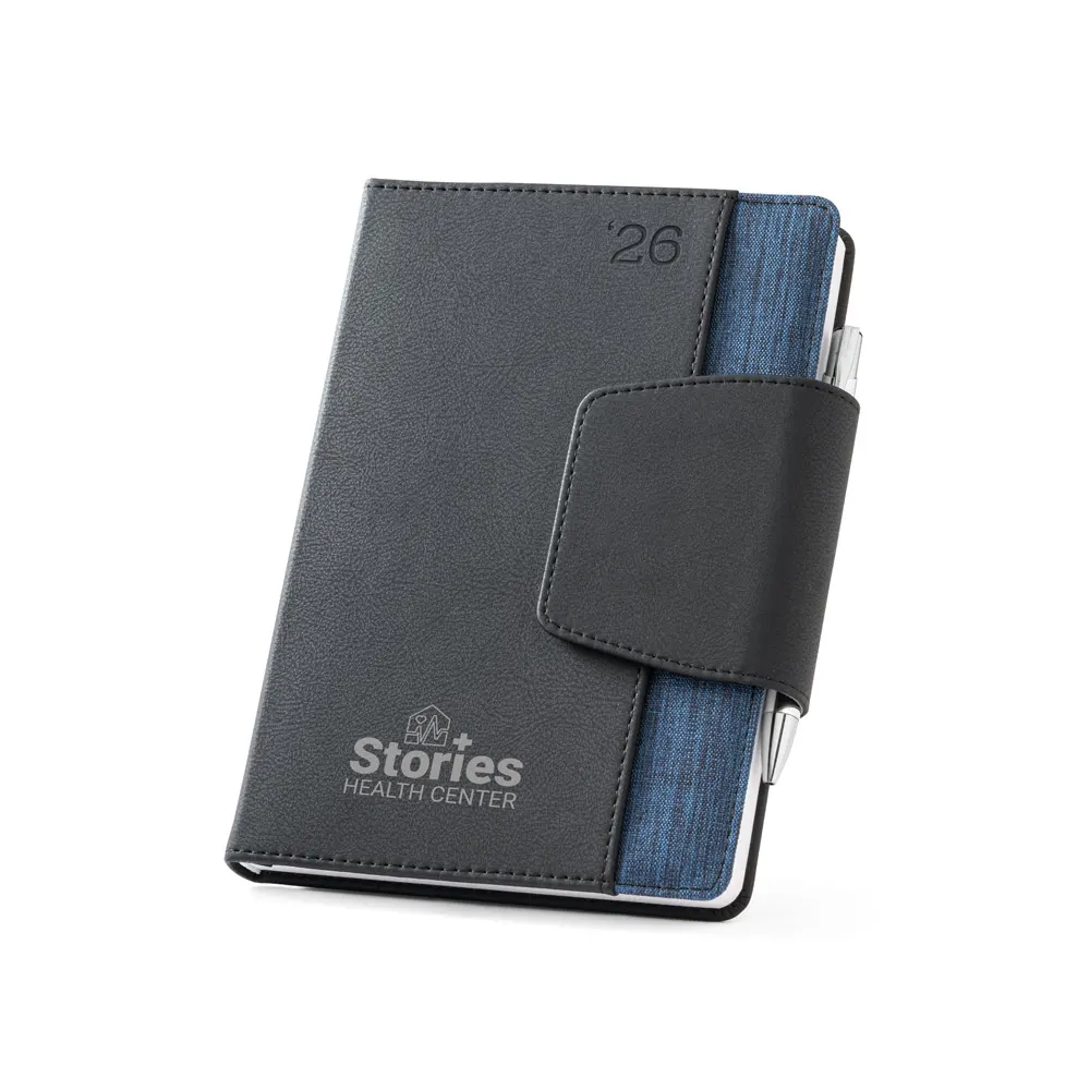Agenda bi-material A5 em c. sintético e tecido em poliéster. Agenda com fecho magnético, bolso frontal e suporte para esferográfica. Fornecida com bolsa de non-woven. Esferográfica inclusa. 148 x 210 mm | Bolsa: 205 x 250 mm