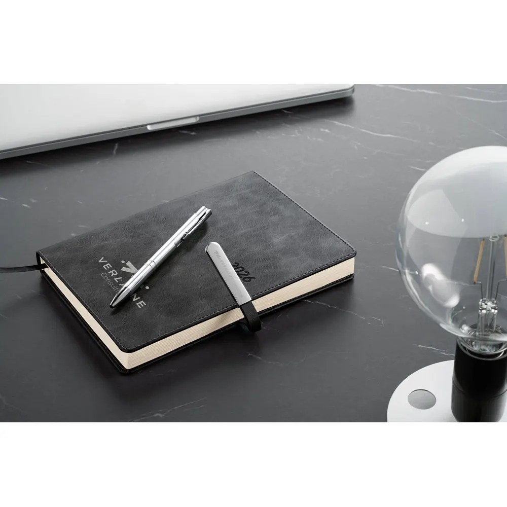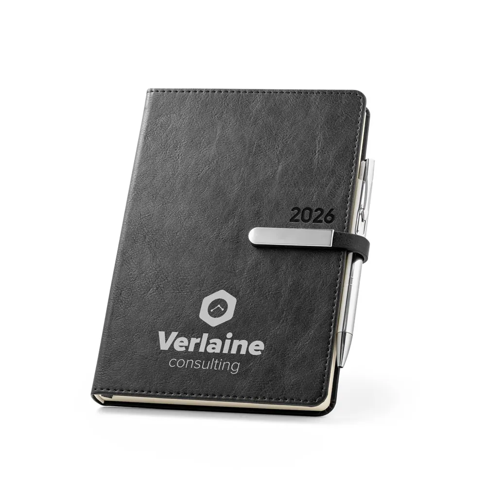 Agenda A5 em c. sintético. Fecho magnético com peça metálica brilhante. Com suporte para esferográfica. Fornecida com bolsa de non-woven. Esferográfica inclusa. 148 x 210 mm | Bolsa: 205 x 250 mm