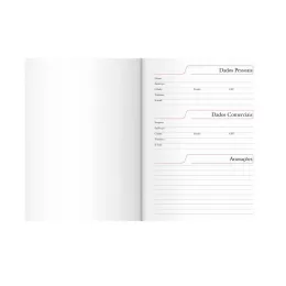 Descrição: Agenda diária 2026 com capa em couro sintético e marca-páginas em fita de cetim. Contém páginas dedicadas para dados pessoais, calendários de 2025 a 2027, lista de contatos, planejamento e mapas.