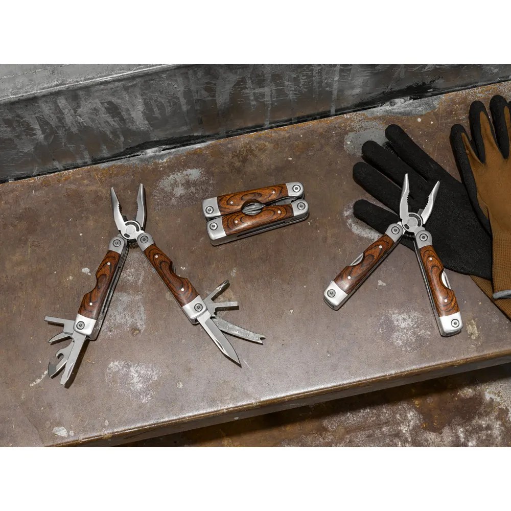 Alicate dobrável com ferramentas multifunções em aço inox e madeira, com 20 funções. Fornecido em bolsa em poliéster. 45 x 100 x 25 mm | Bolsa: 65 x 140 x 30 mm