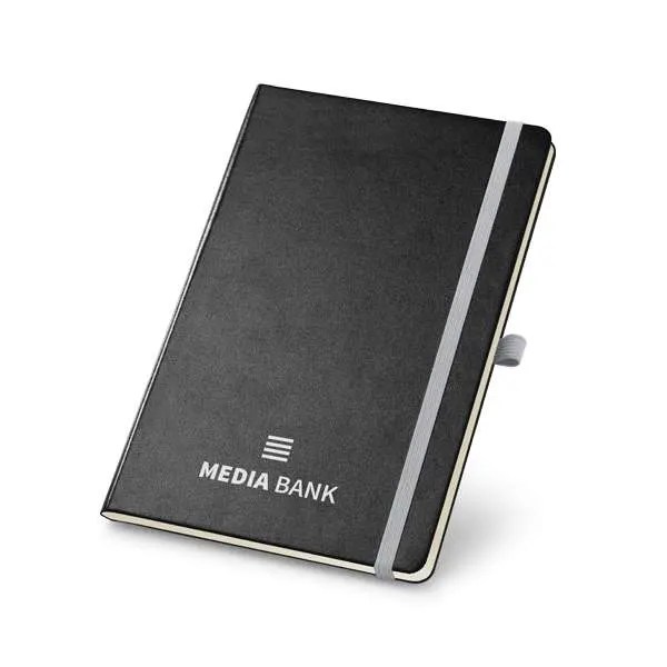 Capa Dura. Com porta esferográfica, bolso interior e 80 folhas não pautadas cor marfim. 137 x 210 mm