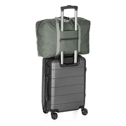 Descrição: Bolsa de viagem dobrável 24 litros em poliéster impermeável com dois compartimentos. Contém bolso para encaixe em malas de viagem.