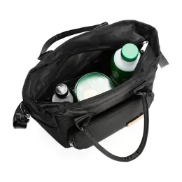 Descrição: Bolsa térmica com capacidade de até 10 litros. Confeccionada em Oxford resistente à água, possui compartimento interno com revestimento térmico em PEVA e fechamento em zíper. Conta ainda com bolso frontal com plaquinha de couro sintético fixada com velcro, um par de bolsos laterais e duas alças fixas para transporte, além de uma alça transversal regulável com mosquetões para encaixe nas fivelas laterais da bolsa.
