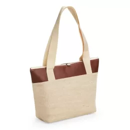 Descrição: Bolsa térmica confeccionada em juta e detalhe em bidim, fechamento em zíper e capacidade de até 12 litros. Possui revestimento térmico em folha de alumínio e um par de alças fixas.