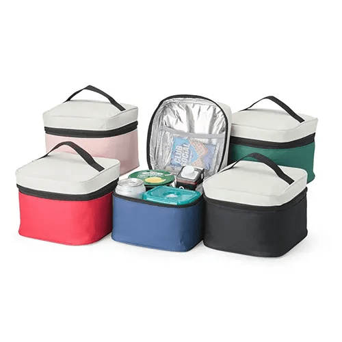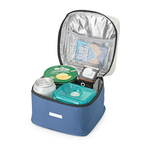 Bolsa térmica de nylon 4 litros. Possui bolso telado e acompanha plaquinha metálica.