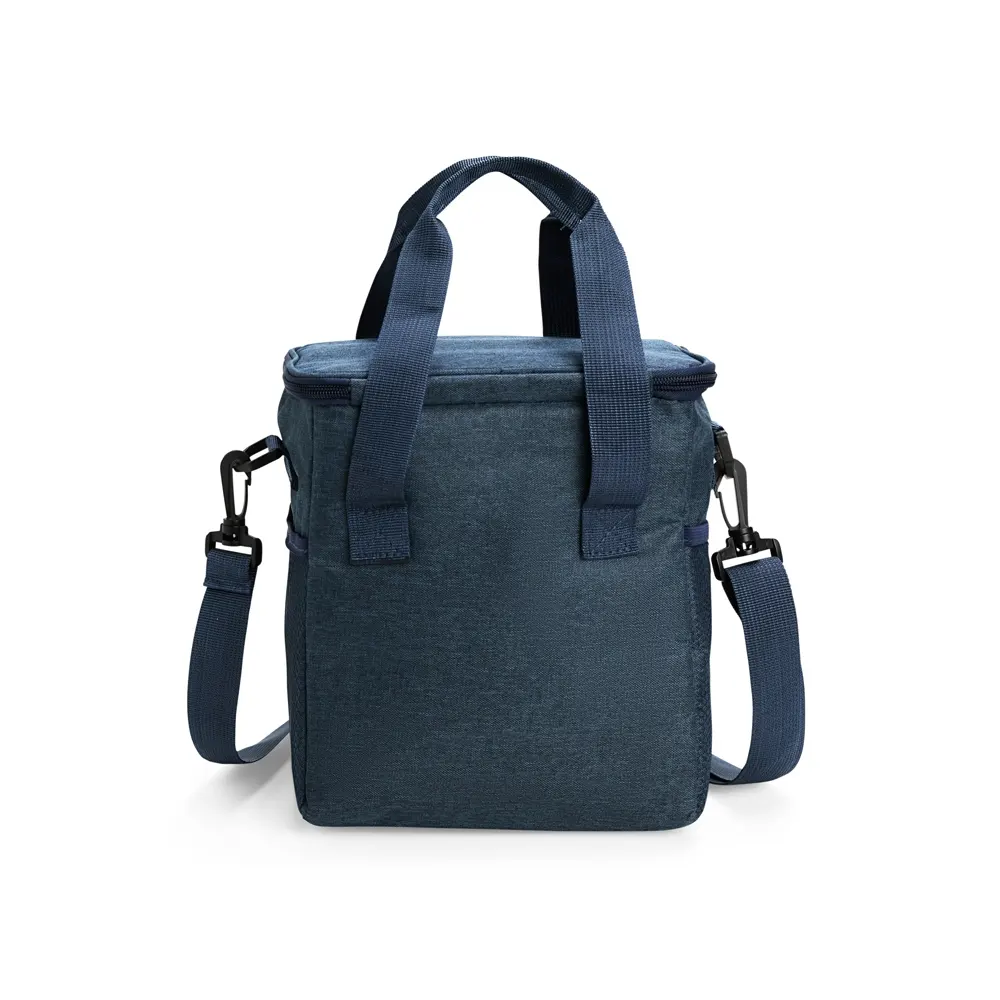 Descrição: Bolsa térmica confeccionada em poliéster com detalhes e alças em algodão e capacidade para até 9 litros. Conta com revestimento térmico em folha de alumínio.
