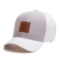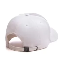Boné modelo 06 gomos, aba curva, confeccionado em lona 100% algodão, frontal revestida com entretela inteligente, estampa frontal bordada com aplicação de etiqueta de couro cortado à laser, ajustador em fivela de metal prata velho.