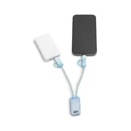 Cabo super-rápido 6 em 1 em PET 100% reciclado. A sua tonalidade de mistura de tons azuis é proporcionada graças ao processo de reciclagem que inclui tampas de garrafas, criando um padrão único em cada unidade. Além de permitir carregamento super-rápido de 65W via USB-C, permite também a transferência de dados. Ambas as extremidades são USB-C, uma com adaptador para USB-A e outra com um adaptador especial 2 em 1 microUSB e lightning. Fornecido em caixa presente de papel kraft reciclado. 180 x 25 x 8 mm | Caixa: 183 x 36 x 15 mm