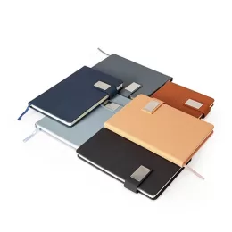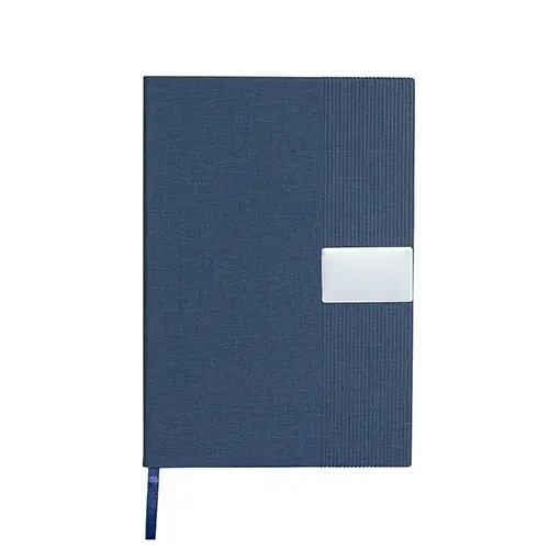 Descrição: Caderneta de capa em couro sintético com detalhes texturizados, plaquinha metálica personalizável, marca-páginas em fita de cetim e aproximadamente 96 folhas marfim pautadas.