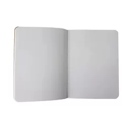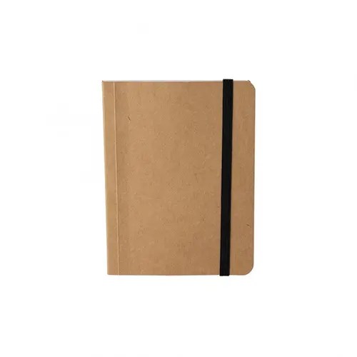 Caderneta em material kraft, frente e verso liso com fita elástica para fechar. Contém aproximadamente 70 folhas brancas sem pauta.