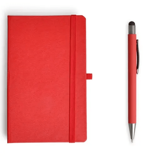 Caderneta para anotações com caneta. A caderneta conta com 80 folhas não pautadas, suporte para caneta e elástico para fechamento. Caneta esferográfica em Alumínio. Conta com acabamento fosco, clipe e ponteira touch em silicone preto. Carga esferográfica azul acionada por um click na extremidade da caneta.