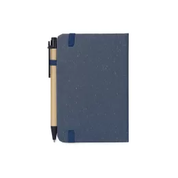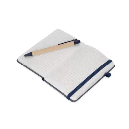 Descrição: Caderneta ecológica de capa dura revestida em fibra de palha de trigo. Contém aproximadamente 80 folhas brancas com pauta, além de duas folhas de guarda, uma fita para fechamento e porta-canetas elástico. Acompanha uma caneta esferográfica de carga azul de 1,0mm com corpo em papelão e clip, acionamento por clique e ponteira em plástico.