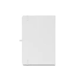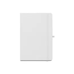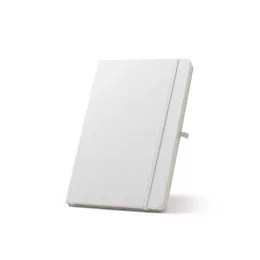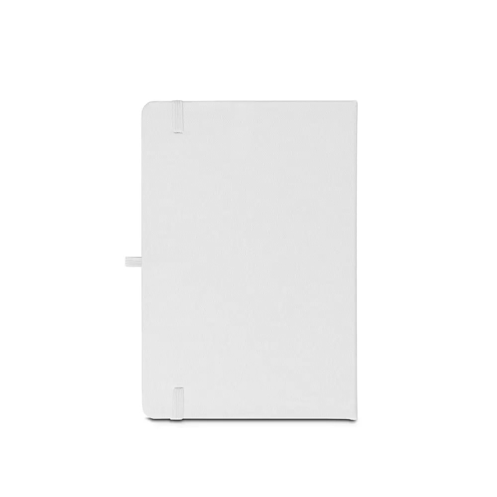 Caderno A5 de capa dura, ideal para personalização em sublimação. O caderno em 300D poliéster 100% reciclado (rPET) tem 160 páginas pautadas em papel 100% reciclado cor de marfim, uma fita separadora, um suporte para esferográfica (não inclusa) e um elástico para fecho do bloco. 143 x 211 mm