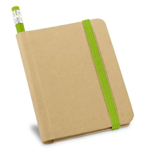 Caderno Capa Dura . Cartão. Com 70 folhas não pautadas de papel reciclado. Incluso lápis. 82 x 105 mm