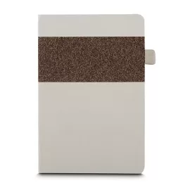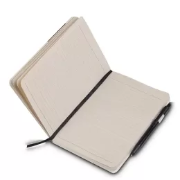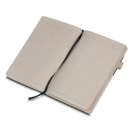 Caderno de anotações, Capa com fibra de cana de açucar, e detalhe em fibra de cafe e PU, suporte para caneta, miolo com 80 folhas pautadas na cor bege.
