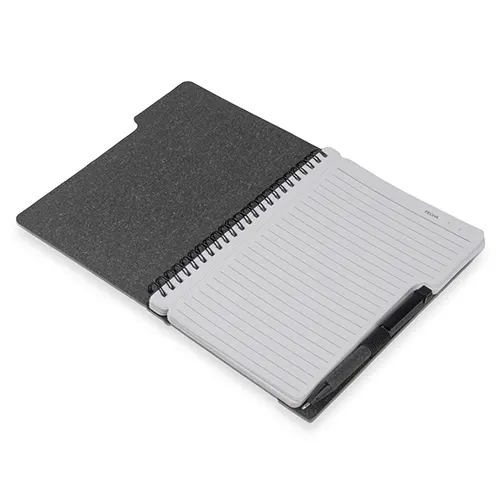 Caderno de anotações em papelão reciclável com suporte para caneta e miolo de 70 folhas pautadas e destacáveis.