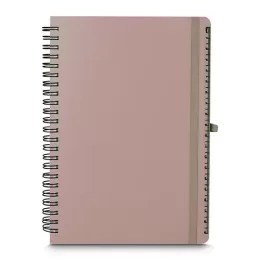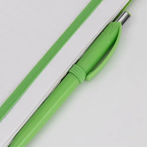 Caderno de anotações em PP(Polipropileno) reciclável com suporte para caneta e miolo de 70 folhas brancas pautadas.