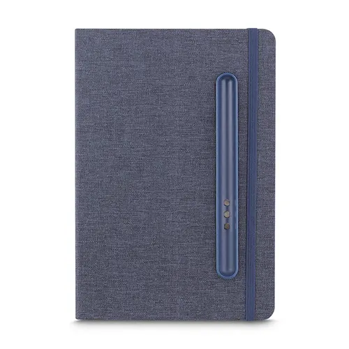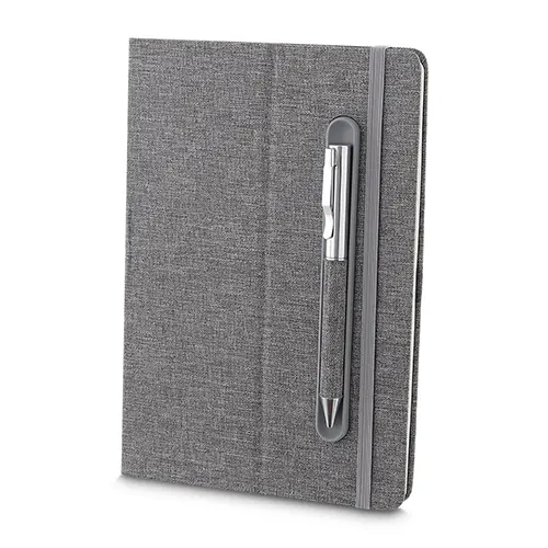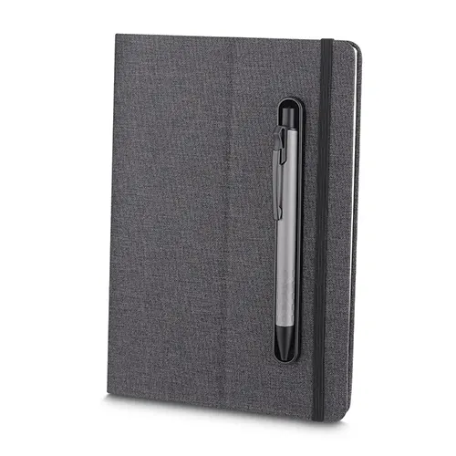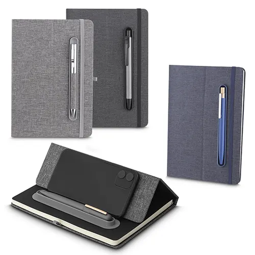 Caderno produzido com capa em tecido RPET e suporte para caneta na capa, capa dobrável para suporte de smartphone, miolo com 80 folhas pautadas.