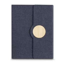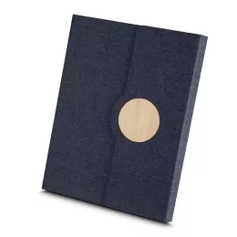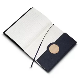 Caderno de anotações, capa em tecido RPET e detalhe em bambú com suporte para caneta na parte interna, miolo com 80 folhas pautadas.