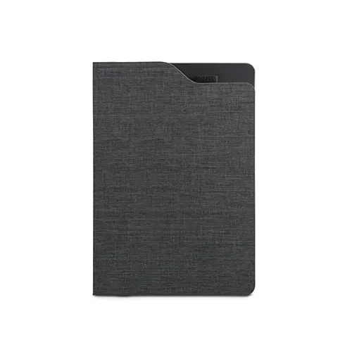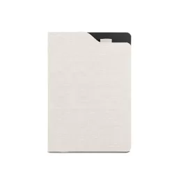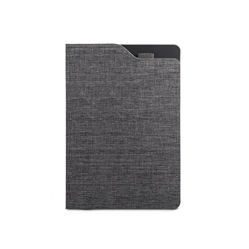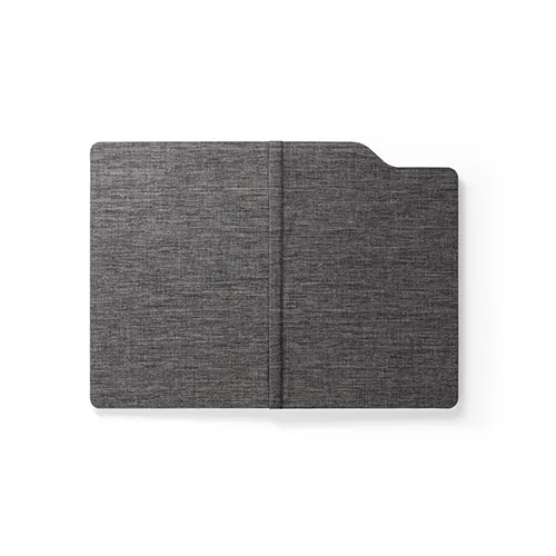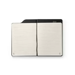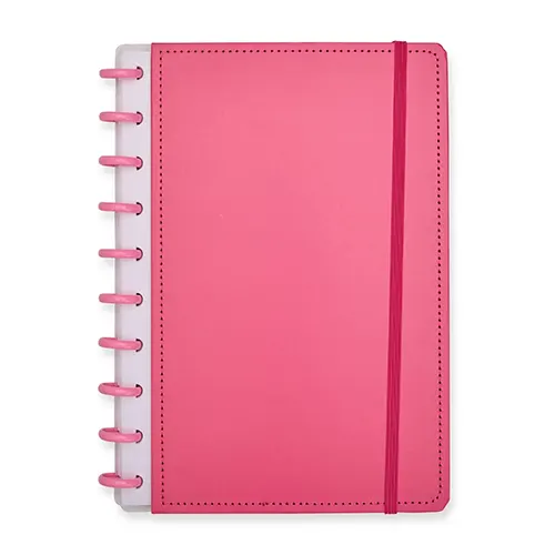 Descrição: Caderno capa dura em papelão, com elástico para fechamento e encadernação em discos plásticos reposicionáveis, que permitem acrescentar ou remover folhas compatíveis com facilidade. Conta com aproximadamente 80 folhas brancas pautadas.