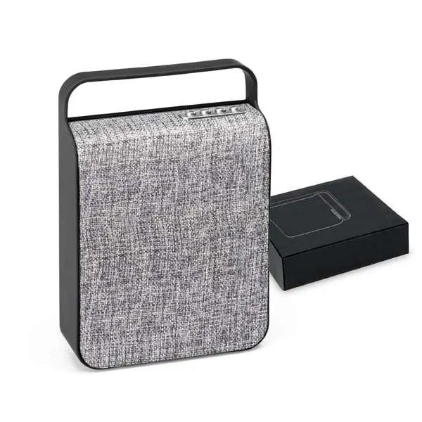 ABS e tecido em poliéster. Acabamento emborrachado. Com transmissão por bluetooth, ligação stereo 3,5 mm e leitor de cartões TF. Com 2 x 3W/4Ω. Autonomia até 3 h. Função para atender chamadas, controle de volume, conexão à playlist do dispositivo móvel e rádio FM. Incluso cabo USB para carregar. Fornecida em caixa de oferta. 155 x 230 x 55 mm | Caixa: 170 x 260 x 70 mm