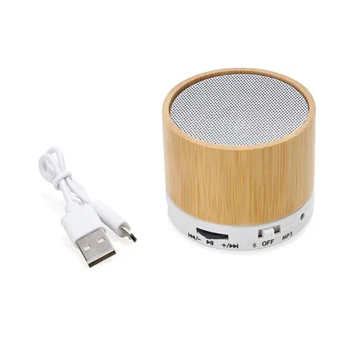 Descrição: Caixa de som multimídia com Bluetooth e rádio FM. Material plástico com acabamento em bambu, possui a parte inferior com detalhes em relevo de algumas funções: botão Off/On; entrada para cartão MicroSD. Parte inferior com detalhe emborrachado anti-deslizante, acompanha cabo USB