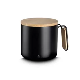 Caneca térmica de parede dupla em inox, com capacidade de 330ml. Contém alça lateral com detalhe e tampa em bambu.