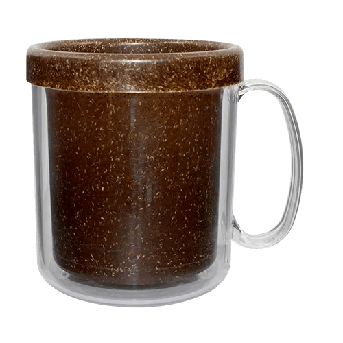 Capacidade para 300 ml. Caneca plástica, atóxica, composta por duas partes, um corpo cristal transparente em Plástico Premium (PS Cristal) e um refil feito com 50% de Fibra Natural de Coco ou Madeira e 50% em Plástico Premium (PP) atóxico. Dupla parede que conserva por mais tempo a temperatura.