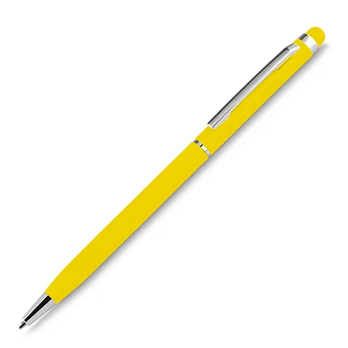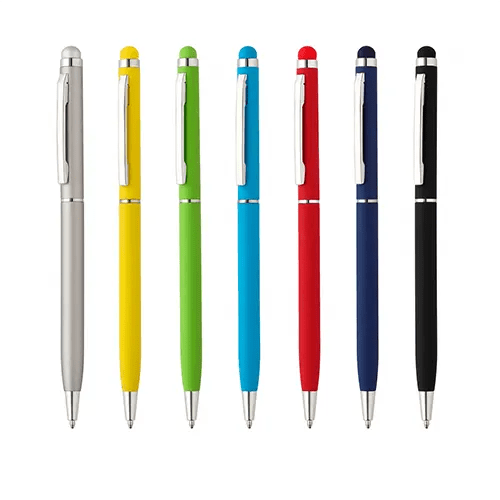 Caneta esferográfica de metal escrita em azul, emborrachada, touch