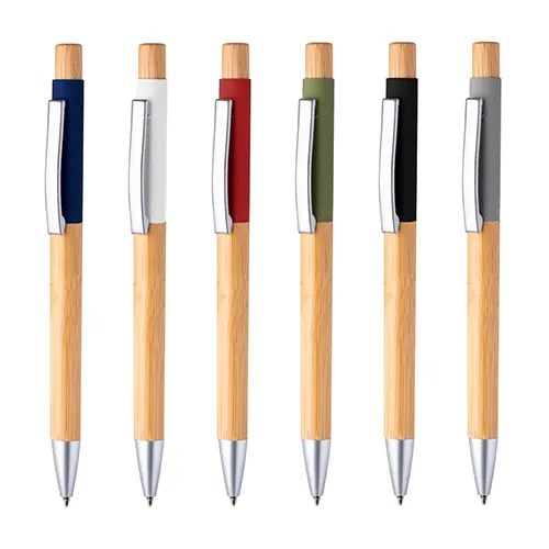 Caneta em alumínio reciclado com detalhe em bambu e acabamento similar à borracha. Possui carga esferográfica azul 1.0 mm e acionamento por clique.