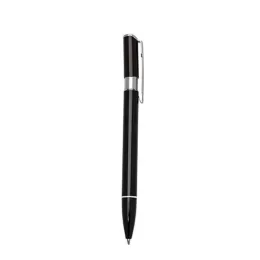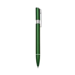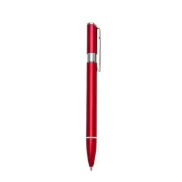 Caneta alumínio inteira colorida com detalhes prata. Possui clip de metal, parte superior e ao redor do clip detalhe prateado. Possui anel inferior prata e aciona por clique.