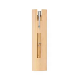 Descrição: A nossa caneta ecológica de bambu é a opção perfeita para acompanhar uma rotina repleta de registros. Com um design elegante, ela conta com clipe metálico, carga esferográfica azul de 1.0mm e acionamento por clique, unindo praticidade e sustentabilidade. Para torná-la ainda mais exclusiva, acompanha um estojo de papel com estampa que imita bambu.