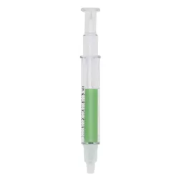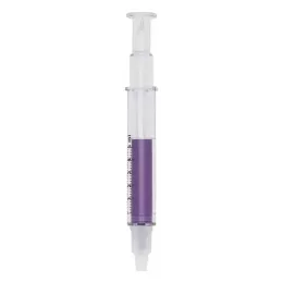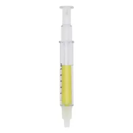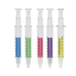 Caneta plástica em formato de seringa, esferográfica e marca texto. Possui medidor imitando uma seringa e tampa protetora nas duas pontas.