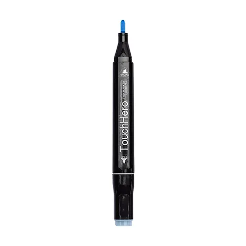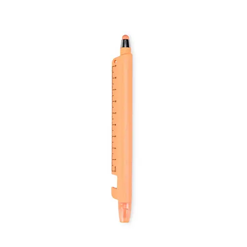 Descrição: Caneta plástica marca-texto de ponta chanfrada com tampa protetora. Conta com uma régua de 9 centímetros e abridor de garrafas integrados ao corpo da caneta, além de uma caneta menor, destacável da estrutura principal, com ponteira emborrachada para interação com telas sensíveis ao toque e carga esferográfica azul de 1.0mm