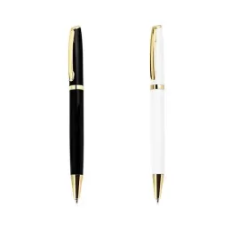 Descrição: Caneta metal com detalhes em dourado. Clip metálico com anel dourado abaixo, esferográfica aciona por giro.