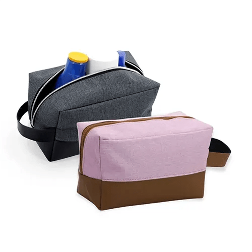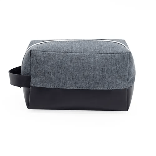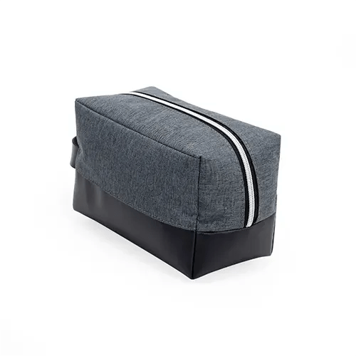 Nécessaire confeccionada em nylon com detalhes em couro sintético, parte interna contém forro de poliéster.