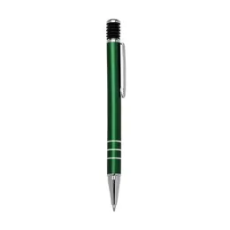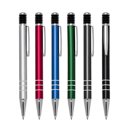 Caneta metal inteira colorida com detalhes prata. Clip metal e mola/sanfona preta no acionador, possui três anéis prata na parte inferior. Aciona por clique.