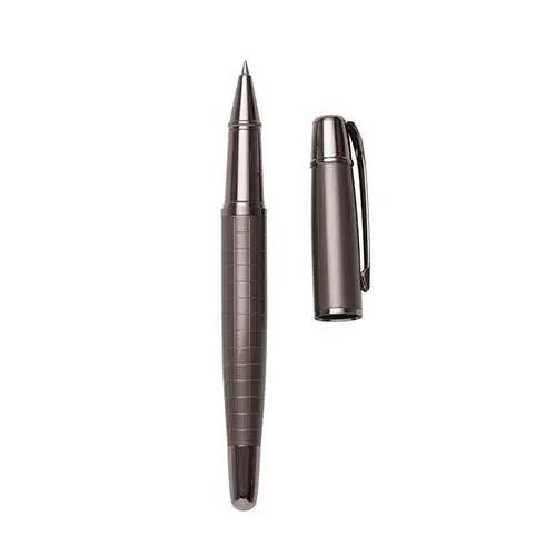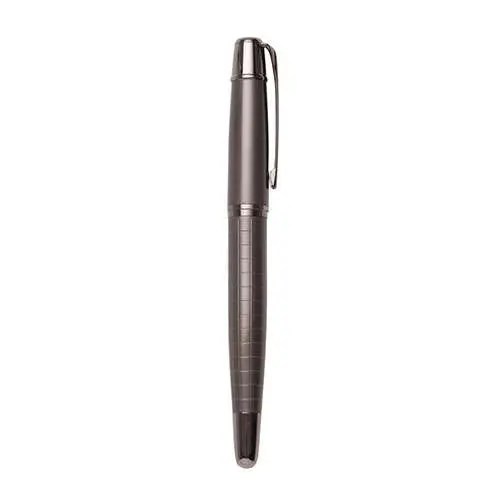 Descrição: Caneta roller metal na cor chumbo com detalhes quadriculados. Clip metal com centro e parte inferior da caneta brilhante. Para utilizar basta tirar a tampa.