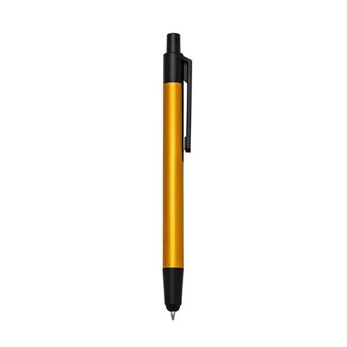 Caneta touch metal inteira colorida com detalhes preto. Clip plástico, possui touch e caneta esferográfica. Aciona por clique, esferográfica sai por dentro do touch.