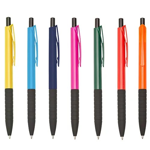 Descrição: Caneta plástica colorida com detalhes preto. Clip plástico com detalhe vazado nas laterais, acionador e parte inferior preta com oito anéis em relevo. Aciona por clique.