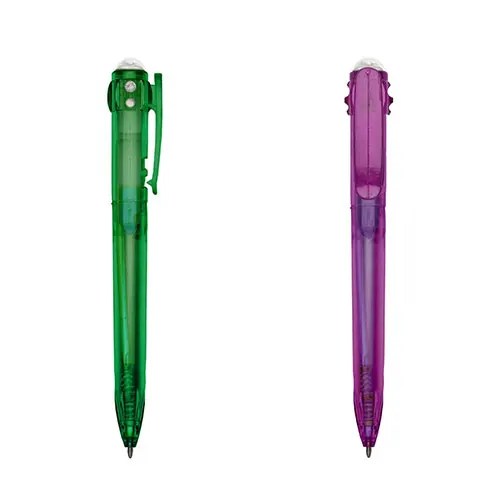 Descrição: Caneta plástica colorida com acionador branco em relevo. Suporte do clip com dois furos em cada lateral e detalhe em relevo, possui anel “vazado” abaixo do clip e detalhes na parte inferior em relevo. Aciona por clique e destrava apertando a parte inferior do clip.