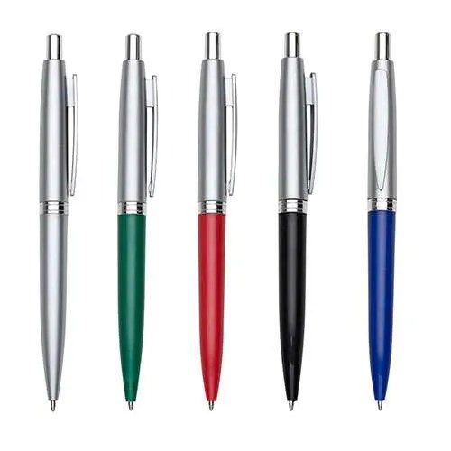Descrição: Caneta plástica prata com detalhe colorido. Clip plástico, possui anel central com detalhes em relevo. Aciona por clique. PEDIDO APENAS MÚLTIPLO DE 50 PEÇAS!