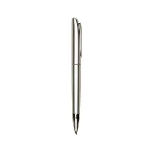 Caneta plástica inteira colorida com detalhes prata. Acionador é o próprio clip plástico, basta apertar parte inferior dele para utilizar a esferográfica e apertar a parte superior do clip pra guardá-la.