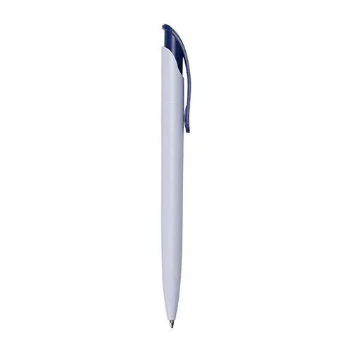Descrição: Caneta plástica branca com clip colorido. Aciona por clique.