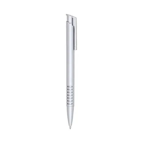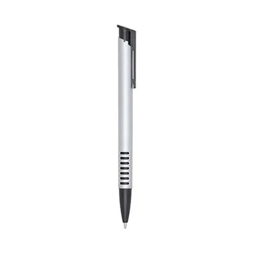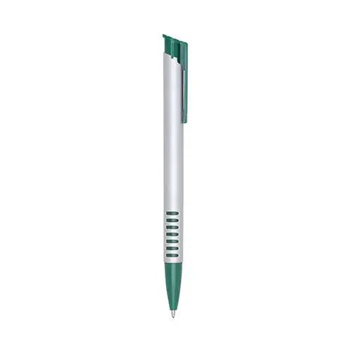 Caneta plástica corpo prata com detalhes coloridos. Clip plástico colorido e parte inferior com sete linhas coloridas. Aciona por clique.