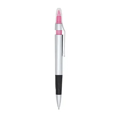 Caneta plástica esferográfica e marca texto com corpo prata. Possui tampa protetora no marca texto e detalhe emborrachado com relevo na parte inferior. Aciona por clique.