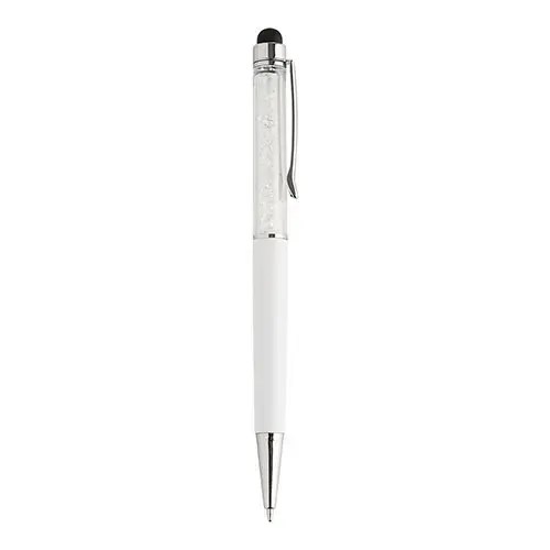 Descrição: Caneta plástica com touch screen e detalhes em cristal, acionamento por rotação e carga esferográfica azul 1mm.