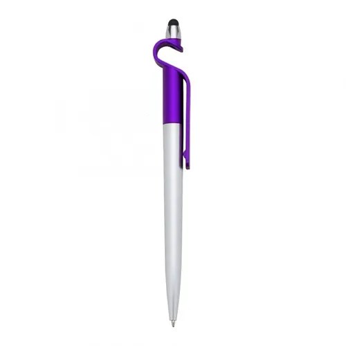 Caneta Plástica Touch com Suporte para celular. Corpo prata com detalhe colorido, clip plástico e borracha touch superior. Aciona por giro.